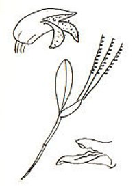 DESCRIPTION: Small to medium sized, cold growing epiphyte with approximate below, proliferating above, stout to slender, erect to suberect ramcauls with a loose tubular sheath near the middle and 2 to 3 imbricating others at the base and carrying a single, apical, erect, coriaceous, elliptical, subacute, cuneate below into the petiolate base leaf that blooms in the winter on an erect, slender, 4 to 8.8 [10 to 22 cm] long, secund, simultaneously densely many flowered inflorescence arising through a foliaceous spathe with an annulus and has thin, tubular floral bracts.