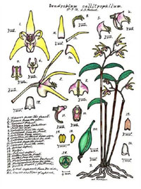 DESCRIPTION: Miniature to small sized, warm to cool growing epiphyte or lithophyte with erect, very slender, basally dark plum colored stems carrying 1 to 2, semi-erect to prostrate, apical, sesslie, ovate, thin, leathery leaves that blooms in the later winter on a terminal, .32 to 1 [.8 to 2.5 cm] long, 1 to 6 flowered inflorescence.