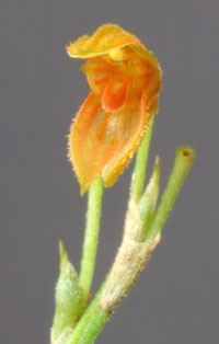 DESCRIPTION: Found as a miniature sized, hot to cool growing epiphyte at elevations of sea-level to 1500 meters in Mexico, Guatemala, El Salvador, Nicaragua, Costa Rica and Panama, French Guiana, Surinam, Guyana and Venezuela in disturbed evergreen forests and on riverbanks and has very short ramicauls enveloped basally by several scarious sheaths and carrying a single, apical, coriaceous, obovate, elliptic-oblong or oblanceolate, obtuse or retuse apically, purple underneath, gradually narrowing below into the conduplicate base leaf that blooms in the spring and summer on a thread-like, warty, to 2 [5 cm] long, 1 to 2 flowered, filiform, fractiflex inflorescence that holds the flower even with the length of the leaves.